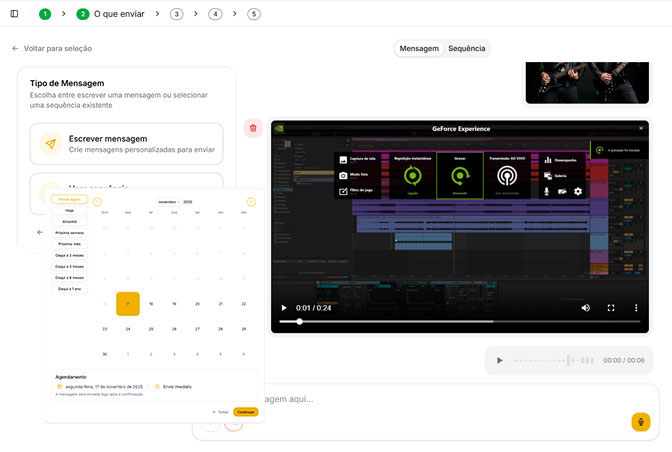 Você cria o conteúdo que quer enviar em cada etapa do seu fluxo. Pode ser texto, áudio, imagem, PDF ou link. Basta adicionar o que deseja comunicar, organizar a ordem das mensagens e deixar tudo preparado do jeito que funciona para o seu atendimento ou venda.