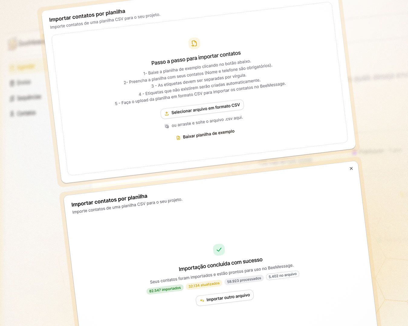 Lançamos a funcionalidade de Importação de Contatos por Planilha, que torna o processo de adicionar novos contatos muito mais ágil. Agora você pode importar sua base em massa através de um arquivo CSV e já aplicar etiquetas automaticamente durante o upload, facilitando a organização, a segmentação do público e o gerenciamento de campanhas para quem lida com um grande volume de números.